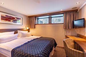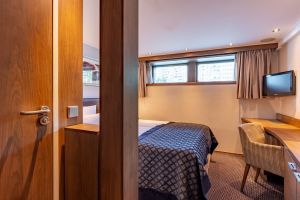 Всички каюти са с индивидуален климатик, баня и тоалетна, телефон, телевизор.