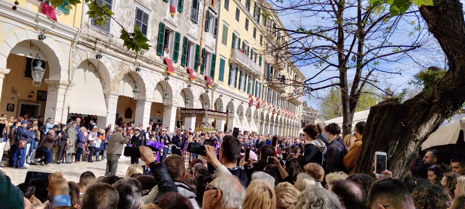 Точно в 09:00 ч. започва и *Първото шествие, наречено от местните Първото Възкресение. Под строга охрана се изнасят мощите на св. Спиридон - закрилникът на острова (мощите му се изнасят само три пъти годишно - на Великден, на 11 август - датата, на която св. Спиридон е спасил острова от нападението на турците, и на празника на св. Спиридон). Шествието започва от горния край на Керкира, виейки се из красивите улички на целия град. Под звуците на тържествената музика на трите филхармонии, предшестващи мощите на св. Спиридон, хората хвърлят карамфили, с които да постелят пътя на светеца. Парадът свършва в 10:30 ч. и тогава започват приготовленията за един оригинален местен обичай - чупенето на глинени съдове.
