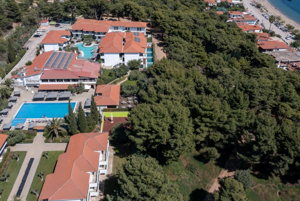Хотелът е разположен сред красива борова гора и се намира само на 200 м от прекрасен пасъчен плаж в курортното селище Псакудия, в Ситония - втория ръкав на Халкидики. Наблизо има център за гмуркане. Отстои на 17 км от руините на древния град Олинт и на 19 км от Археологическия музей в Полигирос. Солун е на около 70 км от хотела.