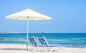 Собствен с фин бял пясък и дължина от 750 м. Чадъри и шезлонги на плажа и басейна - безплатно, плажни кърпи - платени и срещу депозит.