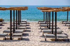 Частен, широк пясъчен плаж, първа брегова линия. Чадъри и шезлонги на плажа и при басейна - безплатно, плажни кърпи - безплатно. Сервират се плодове, вода, сокове, алкохолни напитки (при запитване).