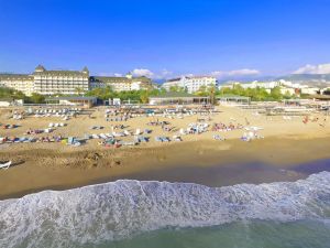 Собствен, пясъчно-чакълест на 500 м от хотела. Чадъри и шезлонги на плажа и при басейна – безплатно, плажни кърпи – срещу депозит.
