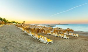 Собствен, пясъчно-чакълест с дължина на плажната ивица 350 м, платформа. Чадъри и шезлонги на плажа и при басейна - безплатно. Плажни кърпи – срещу депозит.