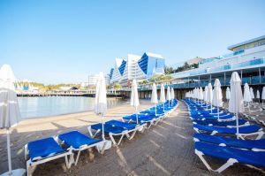 Собствен, пясъчно-чакълест, платформа. Чадъри и шезлонги на плажа и при басейна – безплатно. Плажни кърпи – срещу депозит.