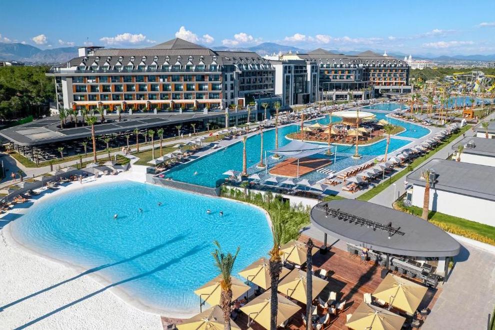 Собствен пясъчно-чакълест плаж, дълъг 350 м, с кей и плажни барове. За удобство на гостите предлага също основен басейн с площ 2000 кв.м, релакс басейн с площ 900 кв.м, Maldiva Pool само за възрастни (16+) с площ 820 кв.м, Infinity Pool с площ 280 кв.м, Indoor Pools, Aquapark Pool, Mega Aquapark Pool, Maldiva Kids Pool и Kids’ Aquapark Pool с 5 пързалки. Чадъри, шезлонги, матраци и плажни кърпи на плажа и при басейните се предоставят безплатно.