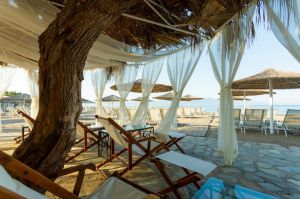 Собствен, пясъчен. Чадъри, шезлонги, матраци и плажни кърпи на плажа и при басейна - безплатно.