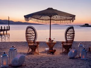 Собствен, пясъчен плаж със Син флаг и дължина от 200 м и платформа 500 m² - чадъри, шезлонги и матраци на плажа и при басейна – безплатно, плажни кърпи – срещу депозит. Частна платформа само за гости на вилите 80 m². И двете платформи са Adults Only. Кабани на плажа срещу допълнително заплащане.