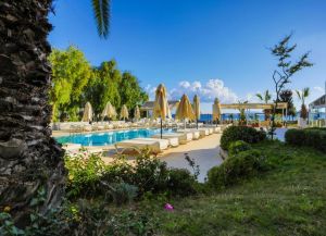 Собствен, пясъчно - чакълест. Чадъри, шезлонги и плажни кърпи на плажа и при басейна – безплатно.