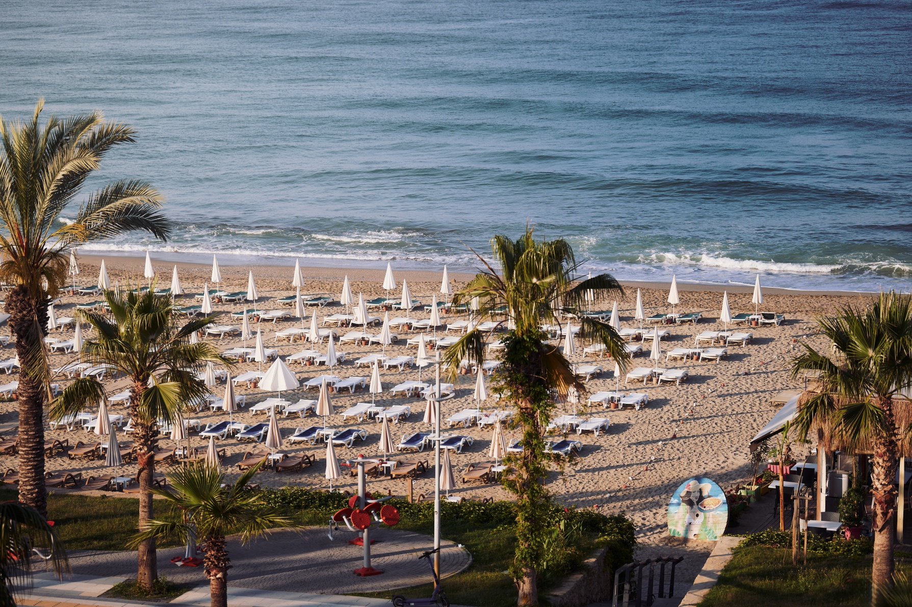Собствен плаж, на 250 м. от хотела, пясъчно - чакълест. Чадъри, шезлонги и кърпи на плажа и при басейна – безплатно