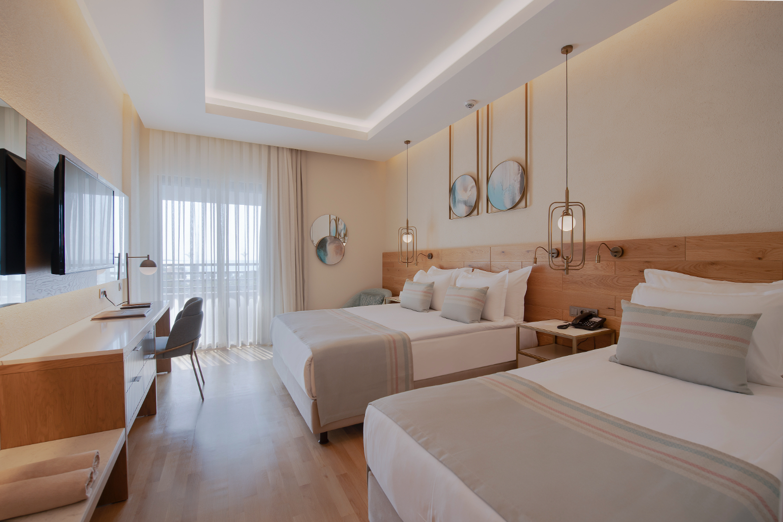 Economy Room (разположени на партерен етаж, без балкон – 26 м2), Superior Room Land View (изглед суша - 30 м2), Superior Room Side Sea View (страничен изглед море - 30 м2), Superior Room Sea View (изглед море - 30 м2), Superior Family Room (2 отделни спални, 2 бани, изглед суша - 42 м2), Superior Corner Room (35 м2), Deluxe Terrace & Jacuzzi Room (с джакузи на терасата, изглед суша/море - 40 м2 + тераса 40 м2), Deluxe Room with Private Garden (разположени в допълнителна едноетажна сграда, с достъп до самостоятелна градина - 80 м2 + градина 38 м2), Suite Room (с джакузи в стаята - 70 м2), Handicap Room (разположена на партерен етаж, без балкон, пригодена за хора с ограничена подвижност – 26 м2).