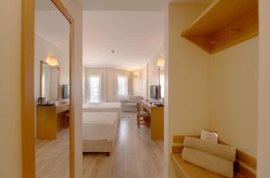Стаи Main Building: Standard room (28 м2), Standard room Sea view (с изглед море - 28 м2), 95 Hotel Family room (2 спални, 1 баня - 43 м2), Junior Suite room (1 спалня, всекидневна, 2 бани - 45 м2), Suite Land view room (с изглед суша, 1 спалня, всекидневна, 2 бани - 40 м2), Suite Sea view (с изглед море, 1 спалня, всекидневна, 1 баня - 50 м2), Suite with Sauna & Jacuzzi* (1 спалня, 2 бани, джакузи – 75 м2), King Suite* (2 спални, всекидневна, 1 баня – 75 м2), Handicapped room (пригодени за хора с ограничена подвижност - 28 м2).