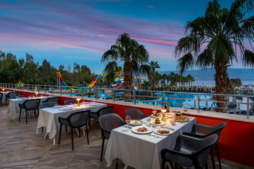 Хотелът има собствен пясъчно-чакълест плаж с платформа и кей. За удобство на гостите си има още 4 открити басейна със сладка вода, неотопляеми. 1 закрит басейн със сладка вода. 5 водни пързалки за възрастни и 3 за деца, неотопляеми, работят по график. Чадъри, шезлонги и матраци на плажа и при басейна се предоставят безплатно.