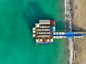 Собствен, пясъчно - чакълест. Чадъри и шезлонги на плажа и при басейна - безплатно. Плажни кърпи – срещу депозит.