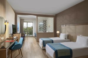 Standard room Land view (изглед суша - 25 м2), Standard room Sea view (изглед море - 25 м2), Superior room Pool view (изглед басейн - 40 м2), Superior room Lake and Garden view (изглед градина - 40 м2), Superior Garden room Terrace (с частна тераса към градината - 40 м2), Family Suite room (2 спални, 1 баня - 36 м2).