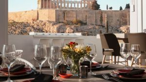 Ресторантът на покрива предлага леки закуски и средиземноморска кухня и разполага с изглед към Акропола.