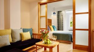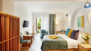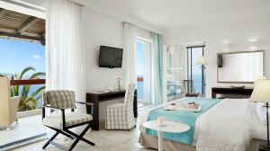 Климатизираните стаи на Eagles Palace - Small Luxury Hotels of the World са елегантно декорирани в естествени цветове и разполагат с луксозни мраморни бани. Те са оборудвани с LCD телевизор със сателитни канали и предлагат гледка към морето или градината.