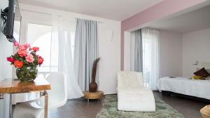 Типичният средиземноморски архитектурен стил и амфитеатрално разположените блокове със стаи осигуряват атмосфера в стил село, що се отнася до хотелските помещения. Стаите са в бутиков стил, всяка със свой уникален характер. Интериорният декор ги прави наистина уникални. Големите балкони със зашеметяващи гледки гарантират спокойна и безгрижна лятна почивка. Плажът Барбати, награден със син флаг от ЕИО, е само на 300 метра от хотела. Има и малък залив точно пред хотела. Пътят надолу може да е малко стръмен, но при пристигане това компенсира усилията.