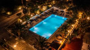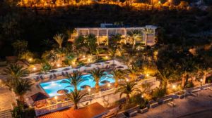 Комплексът се намира на 1,5 км от Лутраки и на 2 км от казино Лутраки, на пясъчен плаж, заобиколен от градина и зеленина, със 100 стаи. Летището на Атина е на час път.