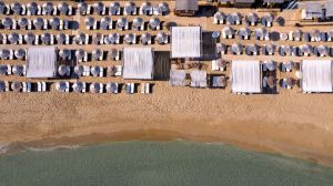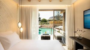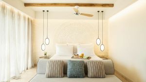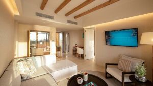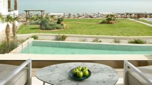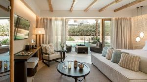 Всяка от климатизираните стаи на Mitsis Rinela Beach разполага с балкон или тераса с изглед към градината или морето, а интериорът им е в топъл стил и разполага с дървени мебели. Налични са минибар, сателитна телевизия и мраморна баня с вана и тоалетни принадлежности. Wi-Fi и сейф се предлагат безплатно.