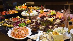 Двата ресторанта и двата бара на Olympia Golden Beach предлагат богата гама от европейски и гръцки ястия. Гръцката закуска в хотела се приготвя с пресни местни продукти. Баровете са отворени през целия ден и до късно през нощта. Осигурен е и денонощен рум-сървис.