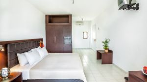 Стаите за гости в Dolphin Beach са просторни и всяка от тях разполага с минибар и телевизор със сателитни канали. Всички те имат обзаведен балкон с изглед към басейна или морето.