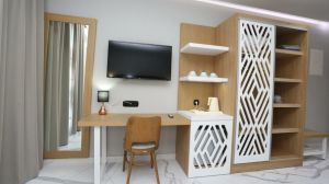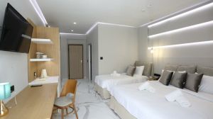 Освен излаз на балкон, всички климатизирани студиа имат декор в земни цветове и мебели от тъмно дърво. Всяко помещение включва кухненски бокс с хладилник, котлони за готвене и електрическа кана. Има сейф, сешоар и телевизор със сателитни канали.