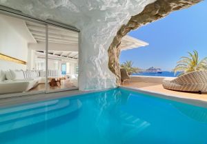 Отличеният с награди хотел Cavo Tagoo се намира в близост до главния град на остров Миконос, Хора, и предлага инфинити басейн с 40-метров бар-аквариум и напълно оборудван СПА център със закрит басейн. Повечето от стаите имат гледка към морето.