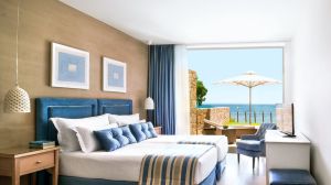Всички стаи в Ikos Olivia са обзаведени в светли тонове и предоставят гледка към басейна, градината или залива Торонеос. Всяка от тях има плоскоекранен телевизор със сателитни канали и DVD плеър. Освен това включват кафемашина и минибар. Модерната баня е с душ или/и вана. Някои типове помещения за настаняване разполагат със собствена градина с шезлонги.