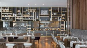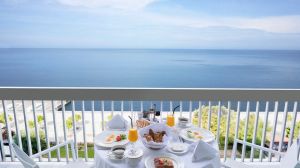 Основният ресторант е разположен точно на брега на морето и предлага изглед към залеза над Солунския залив. Крайбрежният италиански ресторант Navona сервира кафе, леки закуски и италиански ястия.