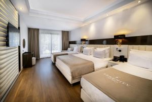 Стаите за гости в хотела разполагат с климатик, кът за сядане, телевизор с плосък екран със сателитни канали, сейф и собствена баня с биде, безплатни тоалетни принадлежности и сешоар. Някои стаи в Serenity Queen Hotel са с изглед към градината, а всяка стая е с балкон. Стаите са оборудвани с гардероб и кафемашина.