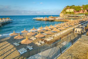 Собствена пясъчно-чакълеста плажна ивица и изкуствена платформа с чадъри и шезлонги за гостите на хотела.