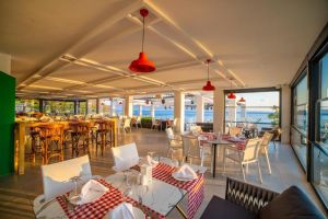 Можете да поръчате напитка в бара и да се полюбувате на залеза над Егейско море.