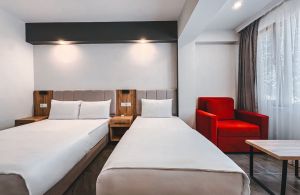 За хотела: Климатизираните стаи в Kum разполагат с мебели от тъмна дървесина. Всяка стая разполага със сателитна телевизия, минибар и чехли. Стаи за настаняване: 72