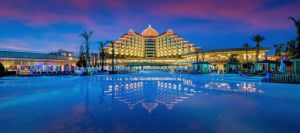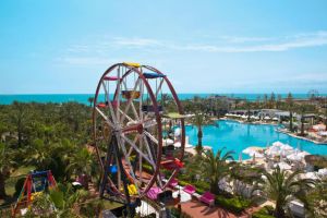Хотел Delphin Palace има 5 звезди и е разположен на първа линия на брега на Средиземно море в Анталия. Той предлага стаи с безплатен Wi-Fi, голям басейн тип лагуна, дневни и вечерни забавления.