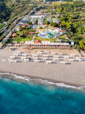 Собствен пясъчно-чакълест плаж, оборудван с чадъри и шезлонги за безплатно ползване от страна на гостите на хотела.